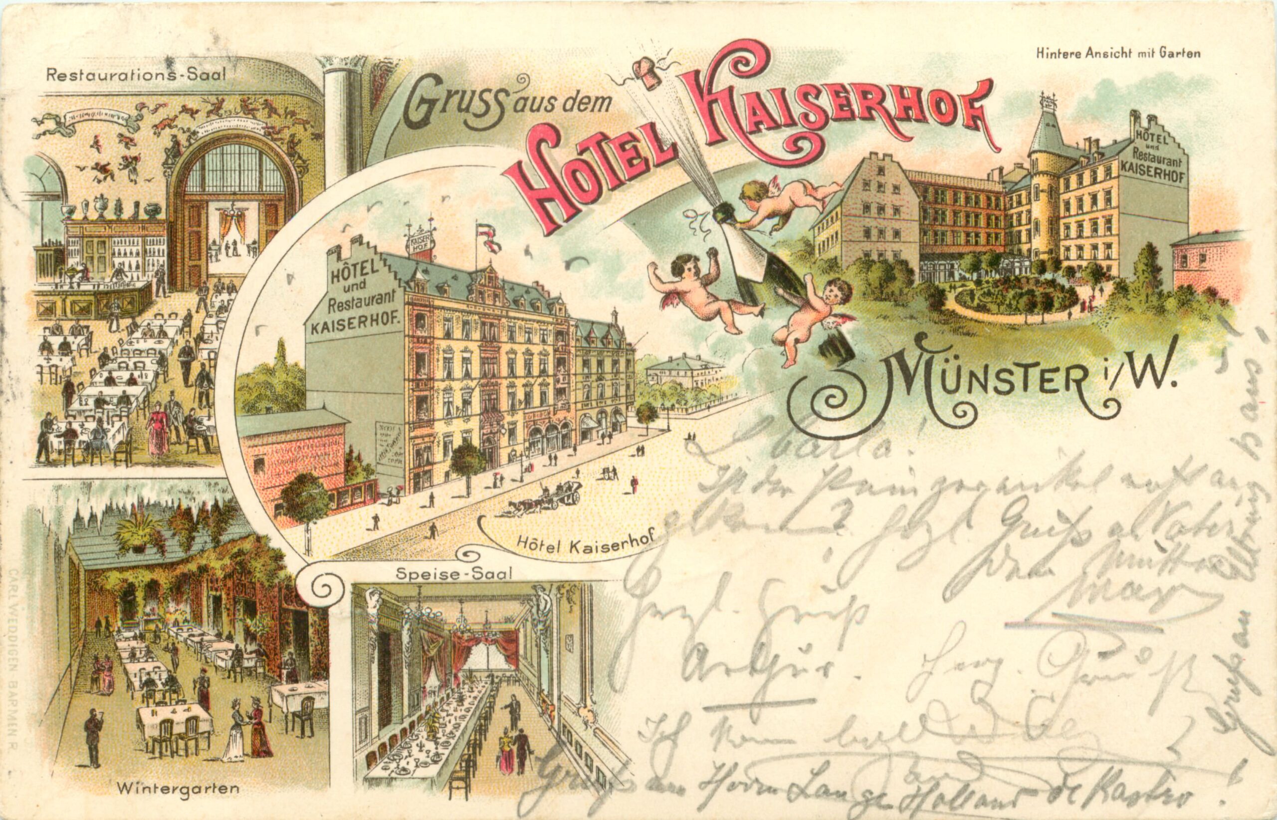 The Kaiserhof was built and opened in 1895 by Oskar Försterling. According to newspaper reports, Oskar Försterling was the tenant of the “Ludgerihof” hotel on Ludgeriplatz, where Stadthaus II is today. The Kaiserhof was located directly opposite the Central Station, which opened in 1890. It had five floors facing Bahnhofstrasse and a wing facing Achtermannstrasse, with a sixth floor housing the staff. It also included an outdoor and winter garden.